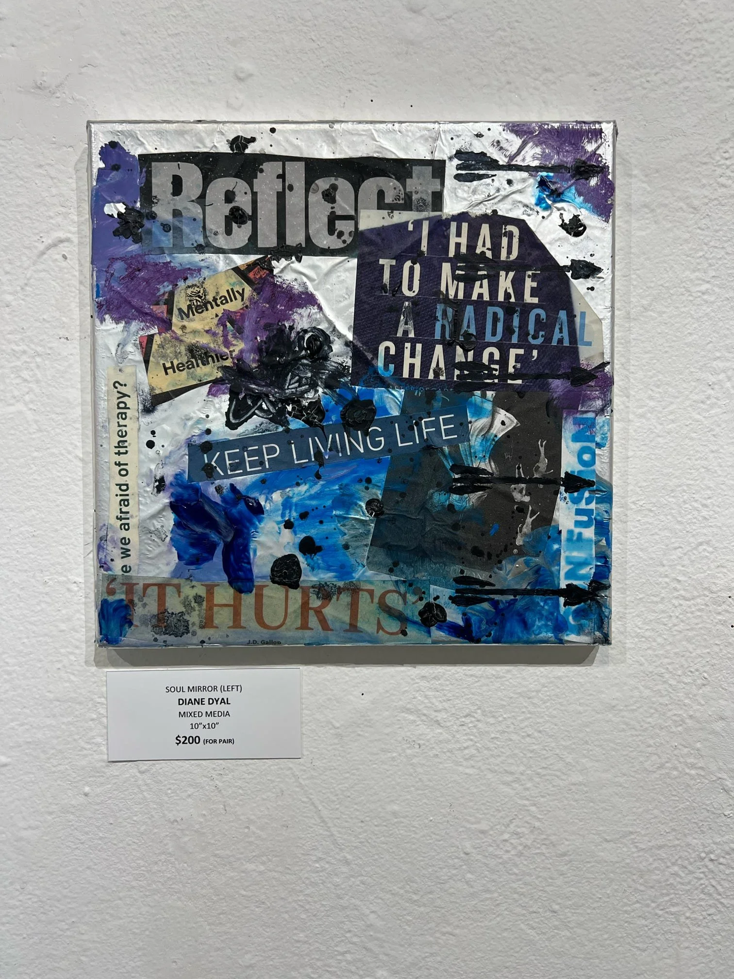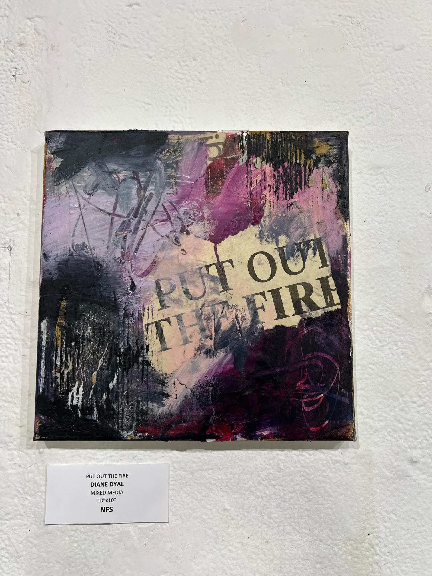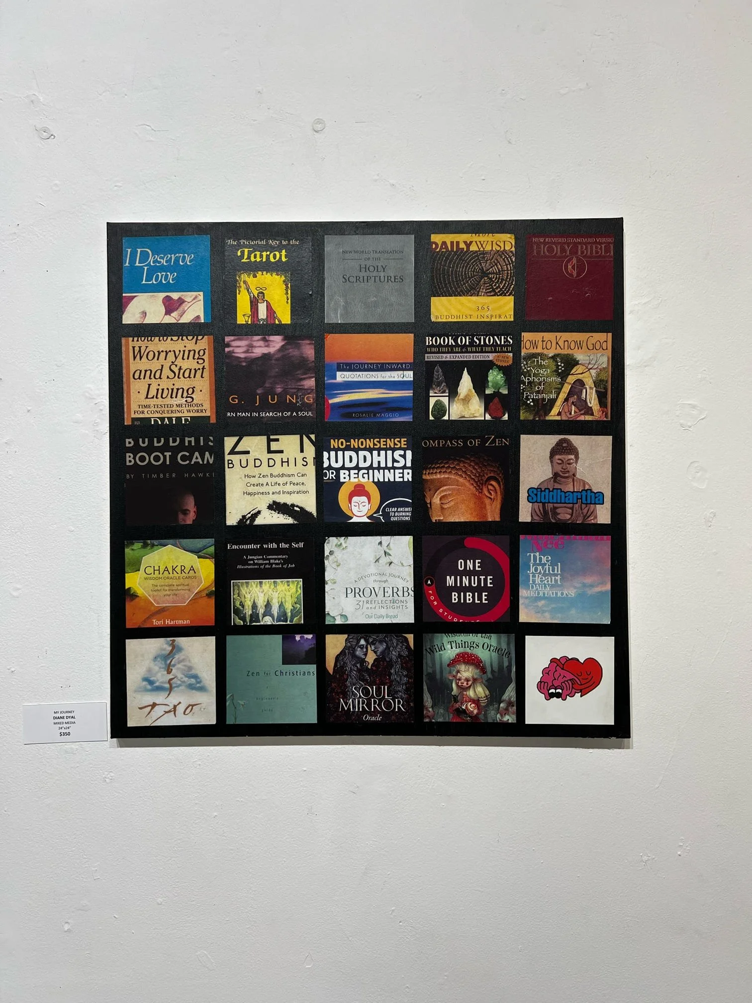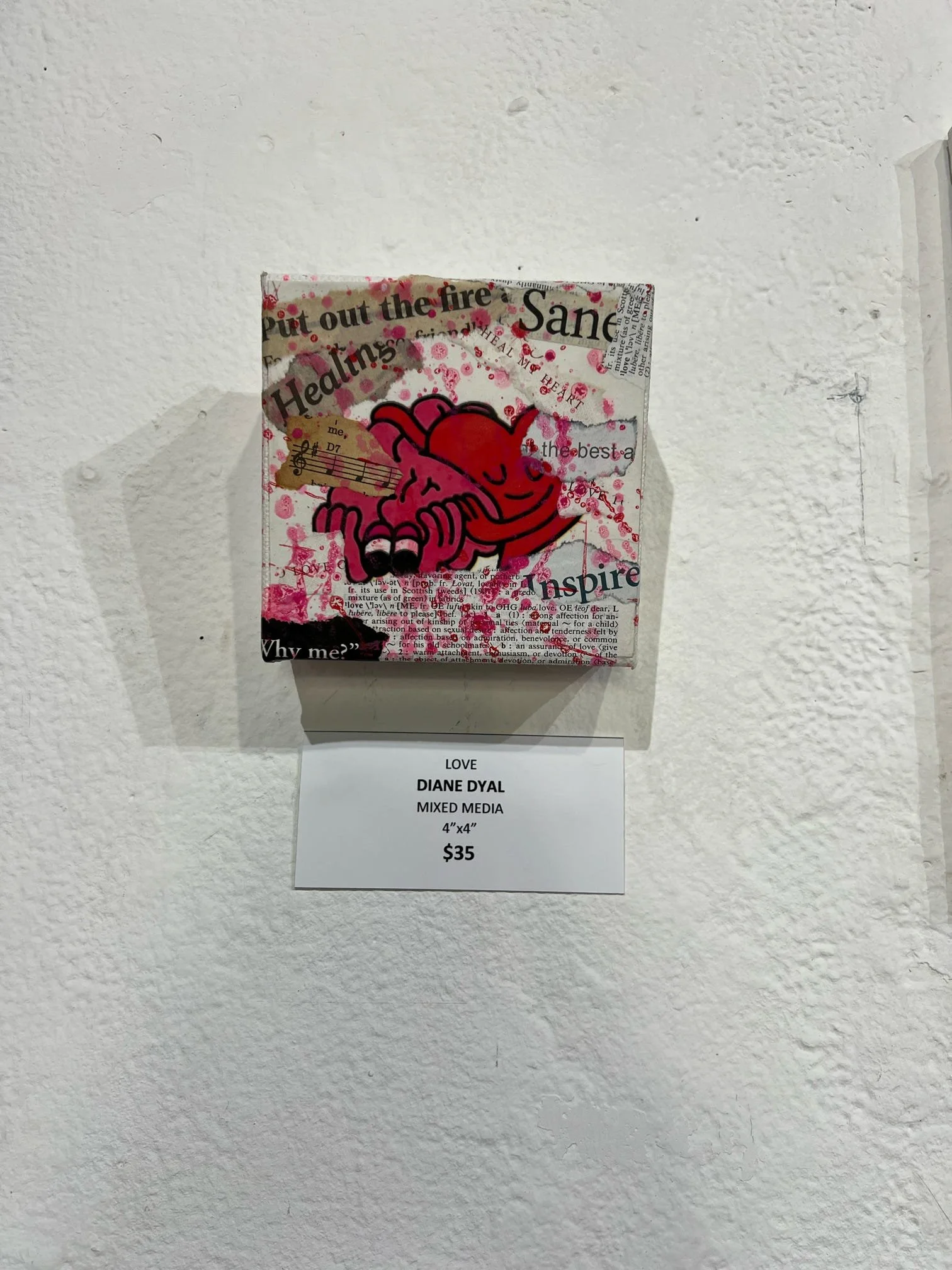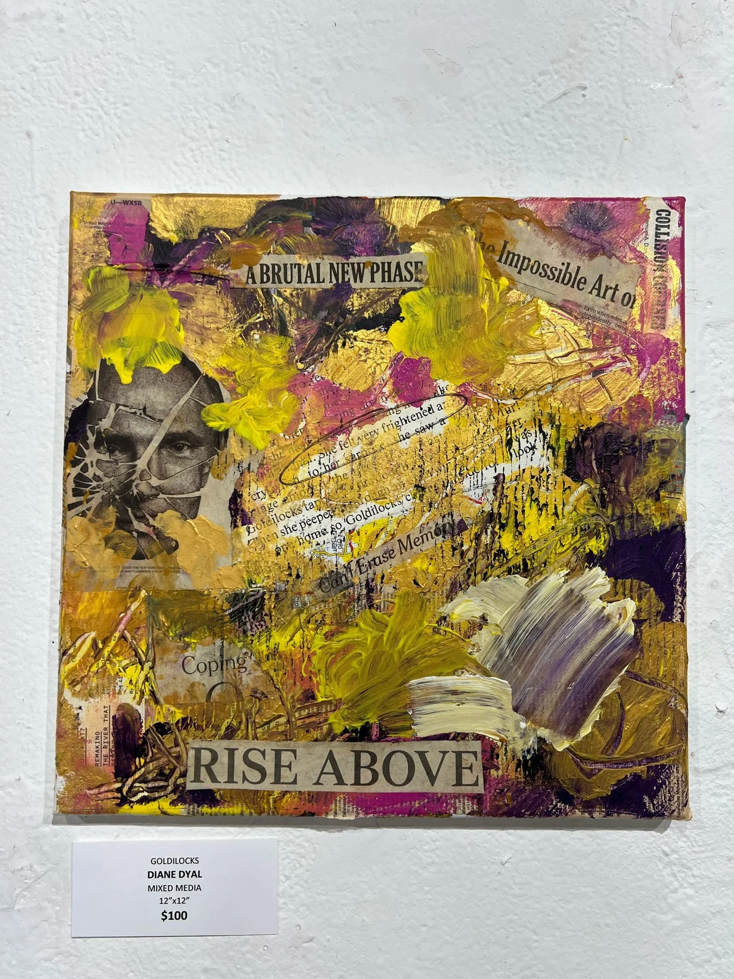 Dyal's muse is her own psyche and she uses this series as art therapy. She uses found objects: from magazine clippings and old book pages to receipts, calendars and vintage miscellany. In addition to these objects she uses acrylic paint in colors that reflect certain feelings. All these things convey the message in each piece's theme.