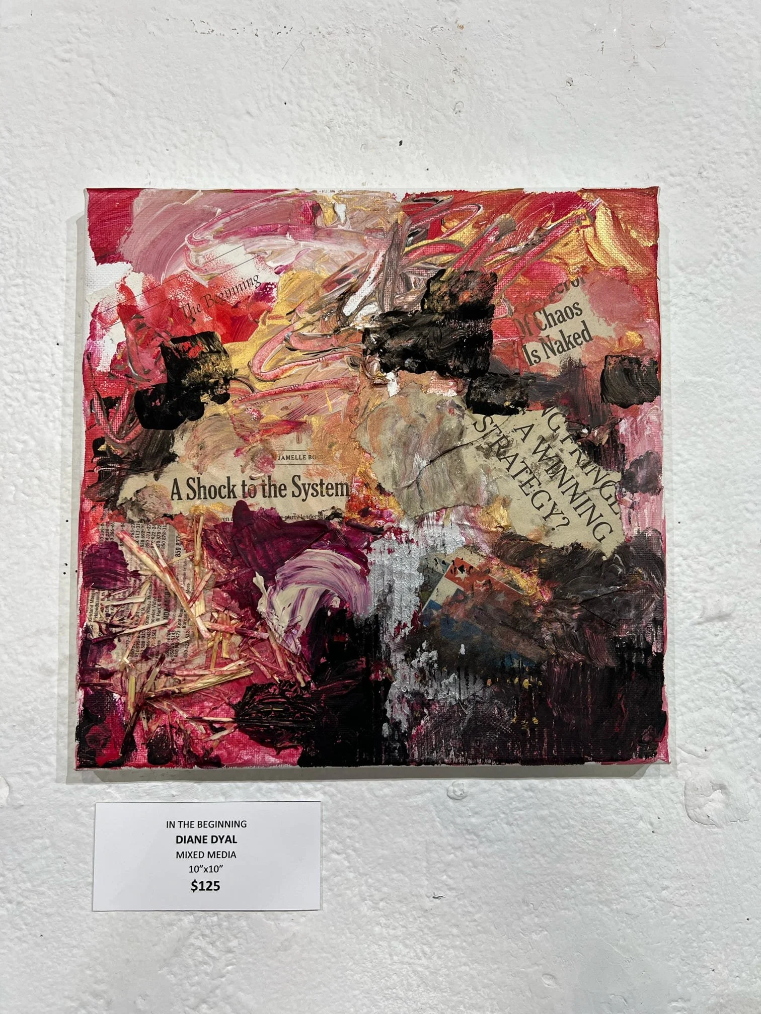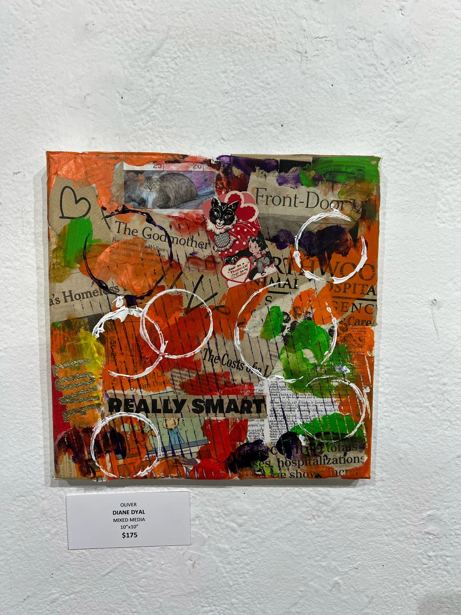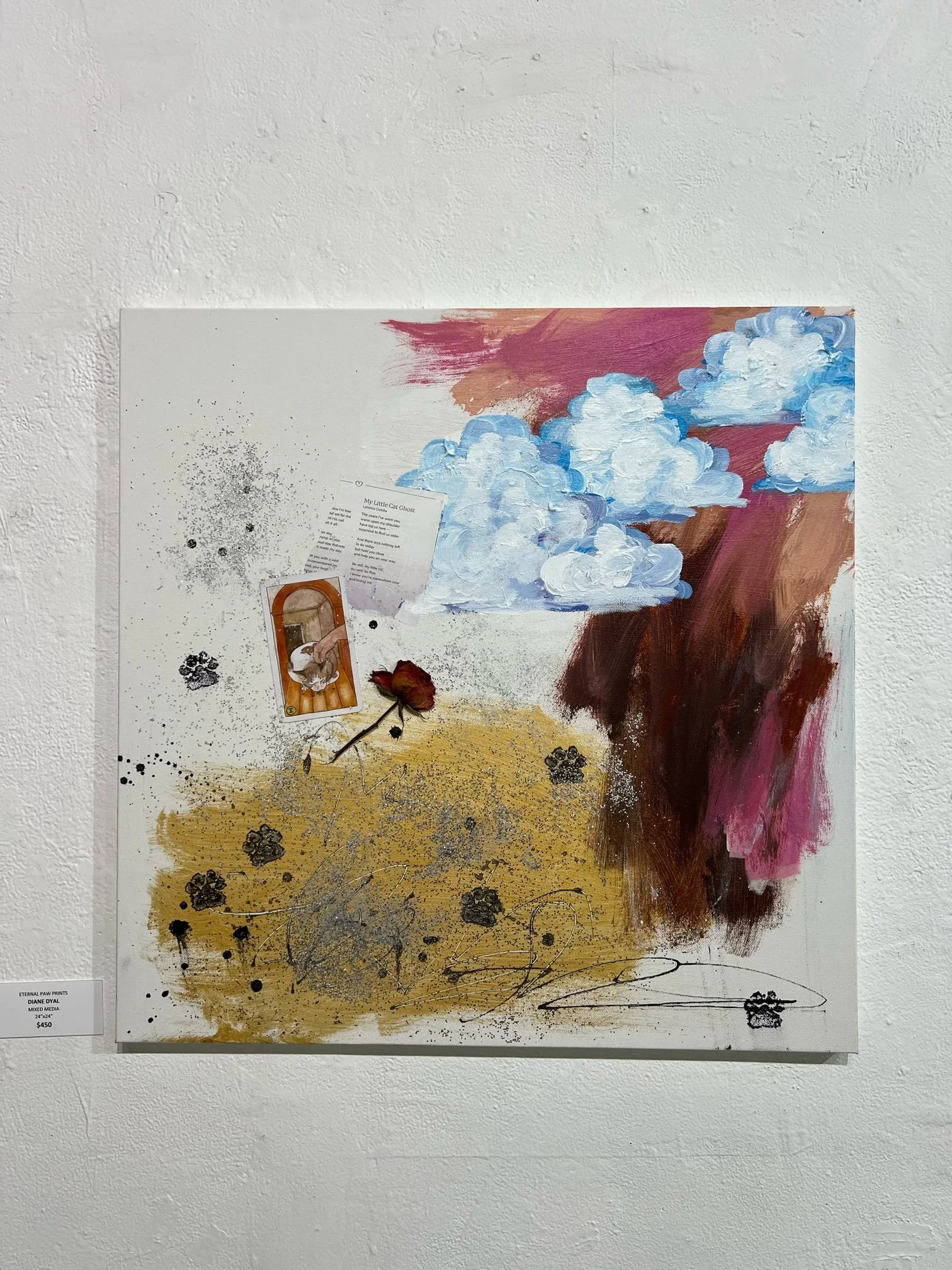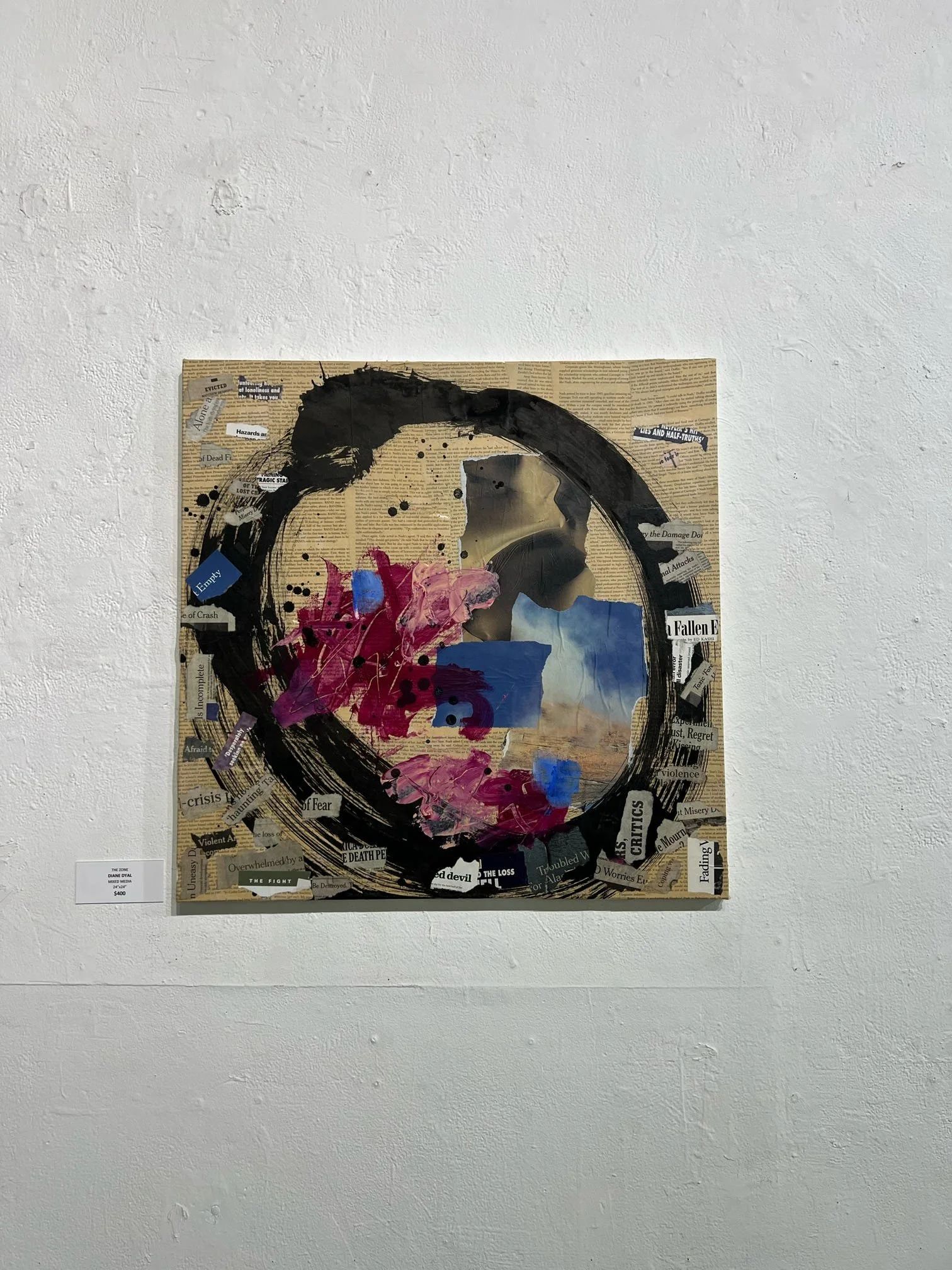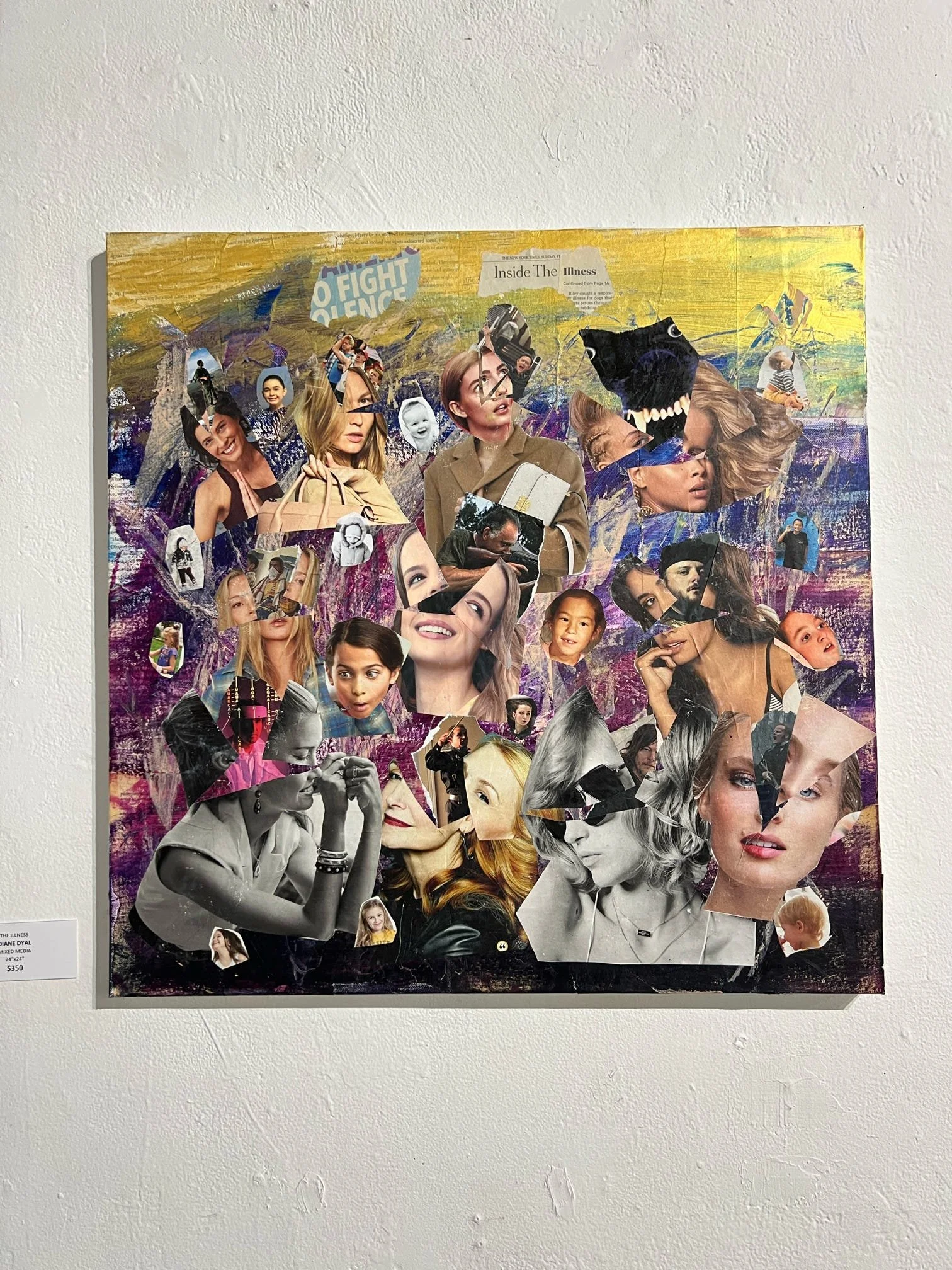 Dyal's muse is her own psyche and she uses this series as art therapy. She uses found objects: from magazine clippings and old book pages to receipts, calendars and vintage miscellany. In addition to these objects she uses acrylic paint in colors that reflect certain feelings. All these things convey the message in each piece's theme.